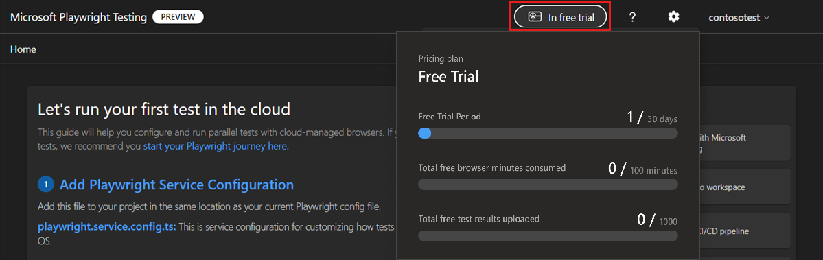 Microsoft Playwright Testing Preview is a fully managed service for end-to-end testing built on top of Playwright. With the free trial, you can try Microsoft Playwright Testing for free for 30 days, 100 test minutes, and 1,000 test results. In this article, you learn about the limits of the free trial, how to get started, and how to track your free trial usage.