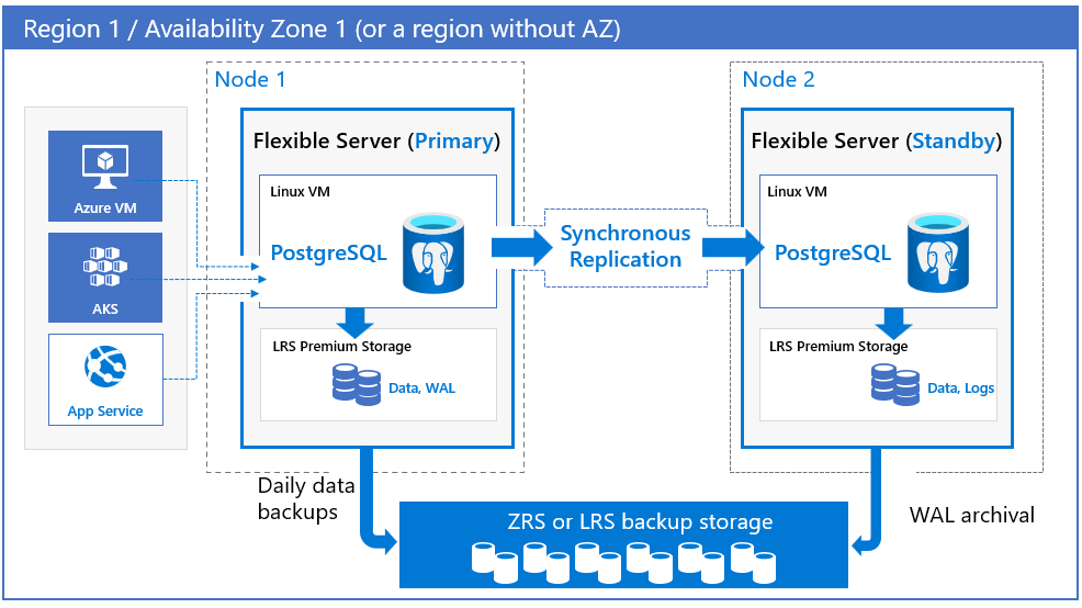 You can choose the region and the availability zones for both primary and standby servers. The standby replica server is provisioned in the chosen availability zone in the same region with a similar compute, storage, and network configuration as the primary server. Data files and transaction log files (write-ahead logs, also known as WAL) are stored on locally redundant storage (LRS) within each availability zone, automatically storing three data copies. A zone-redundant configuration provides physical isolation of the entire stack between primary and standby servers.