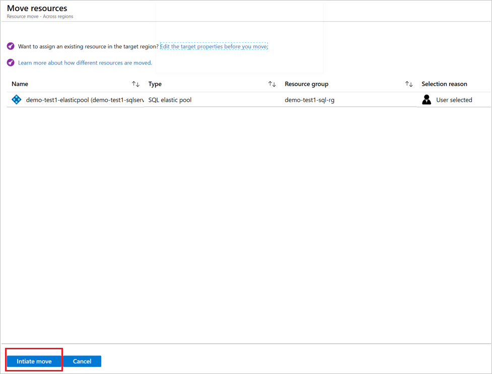 In Across regions, select the source elastic pool (demo-test1-elasticpool in our walkthrough), and then select Initiate move.