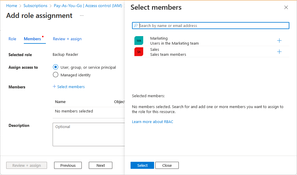 Or, on the Select members pane, you see a reduced set of principals.