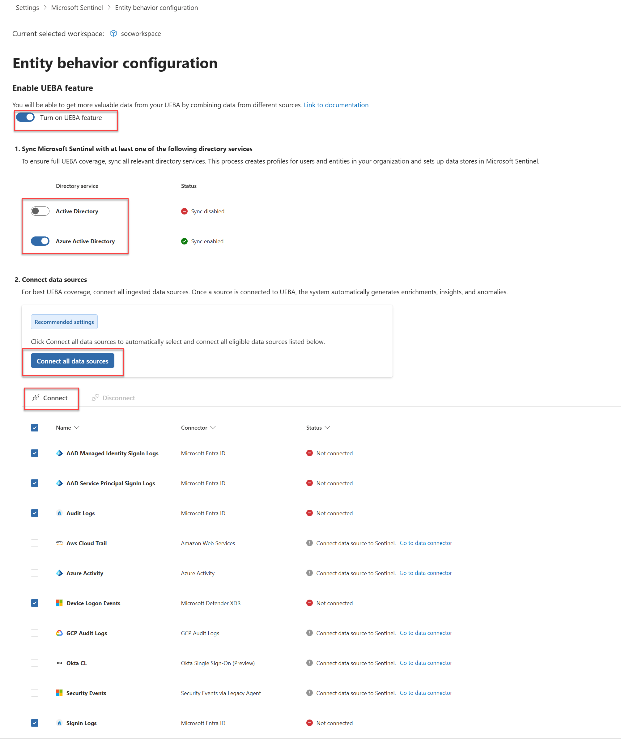 This article explains how to enable UEBA and configure data sources from your Microsoft Sentinel workspace settings and from supported data connectors.