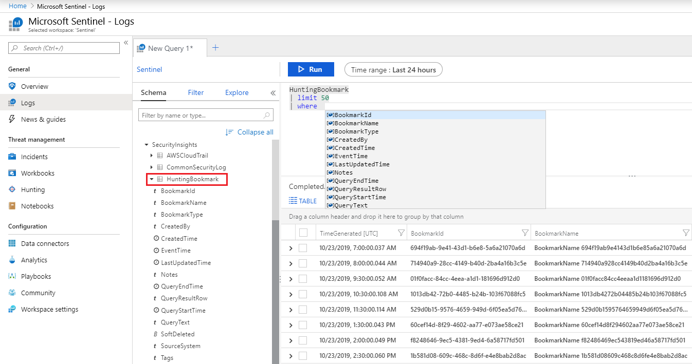 View your bookmarked data directly in the HuntingBookmark table in your Log Analytics workspace. For example: