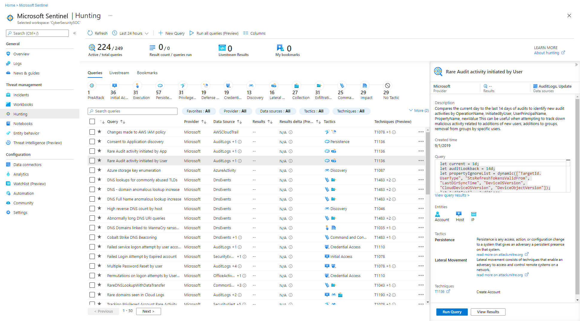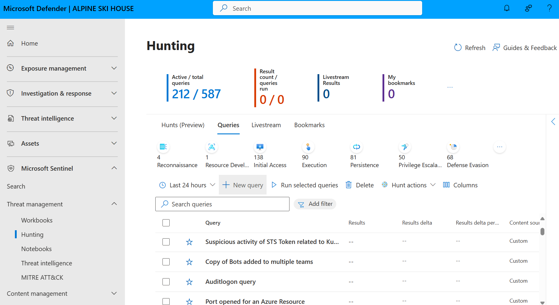 Use the queries tab to identify where to start hunting, by looking at result count, spikes, or the change in result count over a 24-hour period. Sort and filter by favorites, data source, MITRE ATT&CK tactic or technique, results, results delta, or results delta percentage. View queries that still need data sources connected, and get recommendations on how to enable these queries.