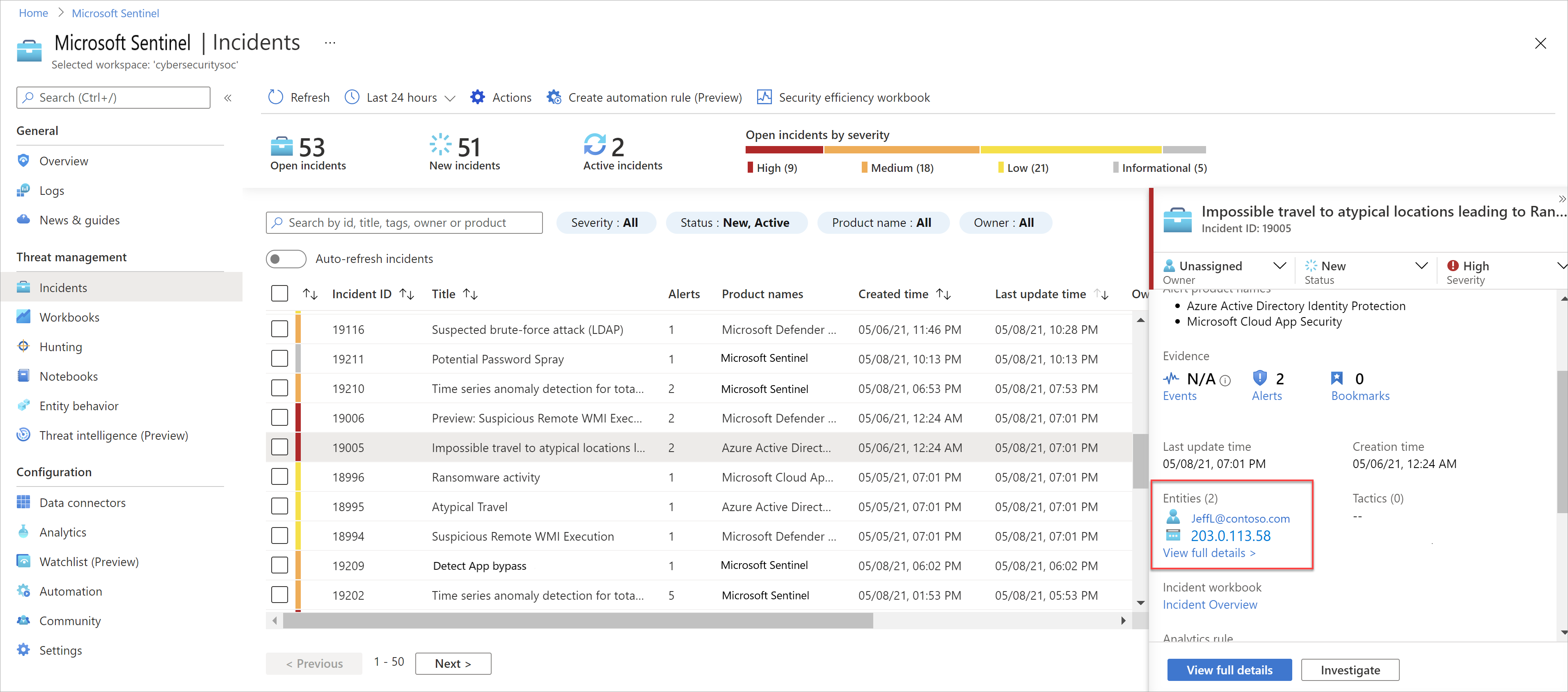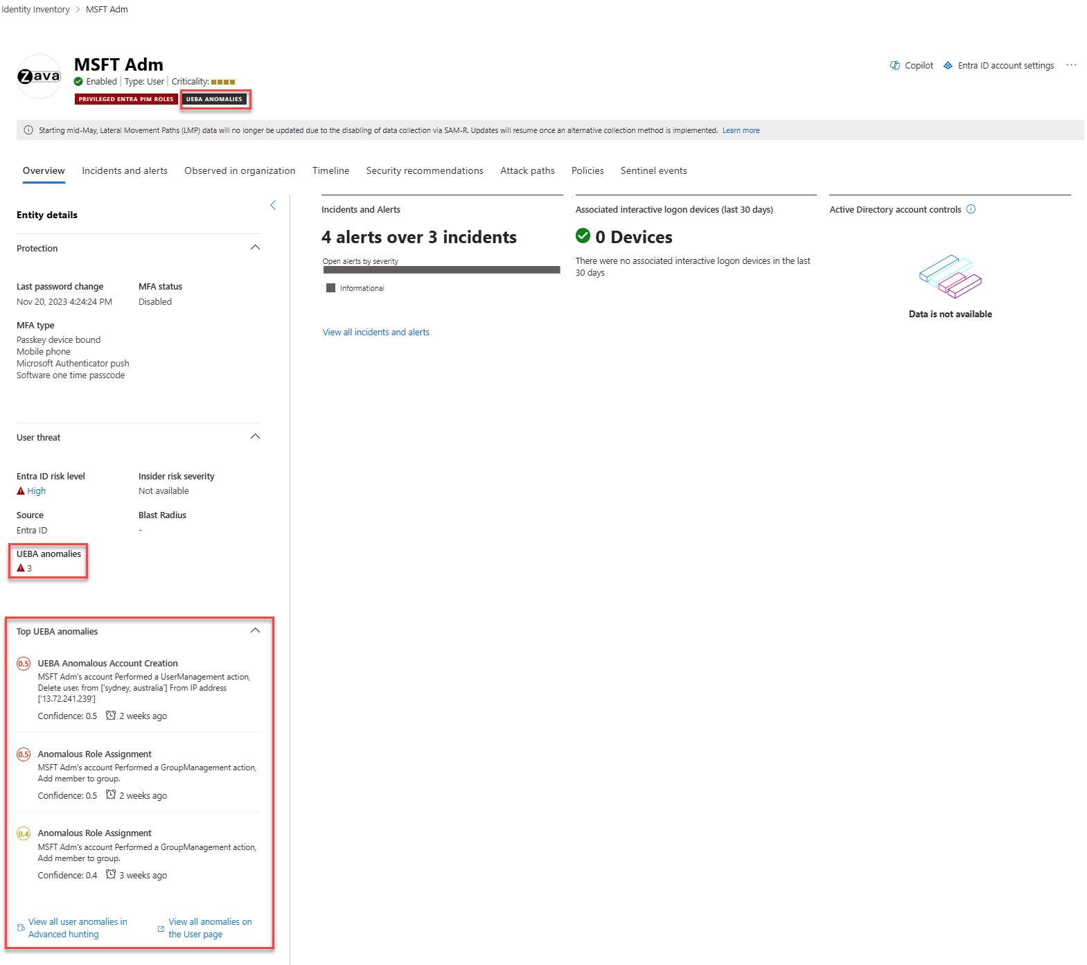 For more information, see Investigate incidents in the Microsoft Defender portal and User entity page in Microsoft Defender.