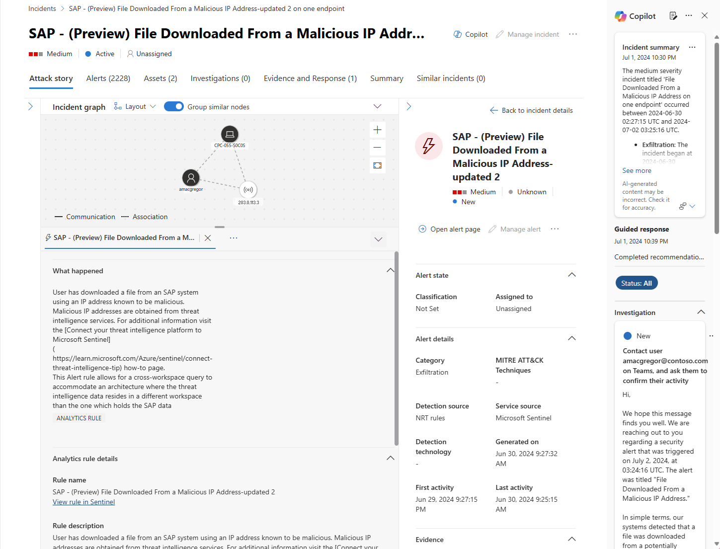 - The near real-time rule SAP - (Preview) File Downloaded From a Malicious IP Address triggers an alert, creating a Microsoft Sentinel incident.