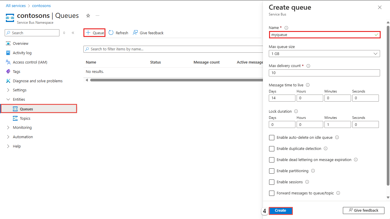 On the Service Bus Namespace page, expand Entities on the navigational menu to the left, and select Queues.