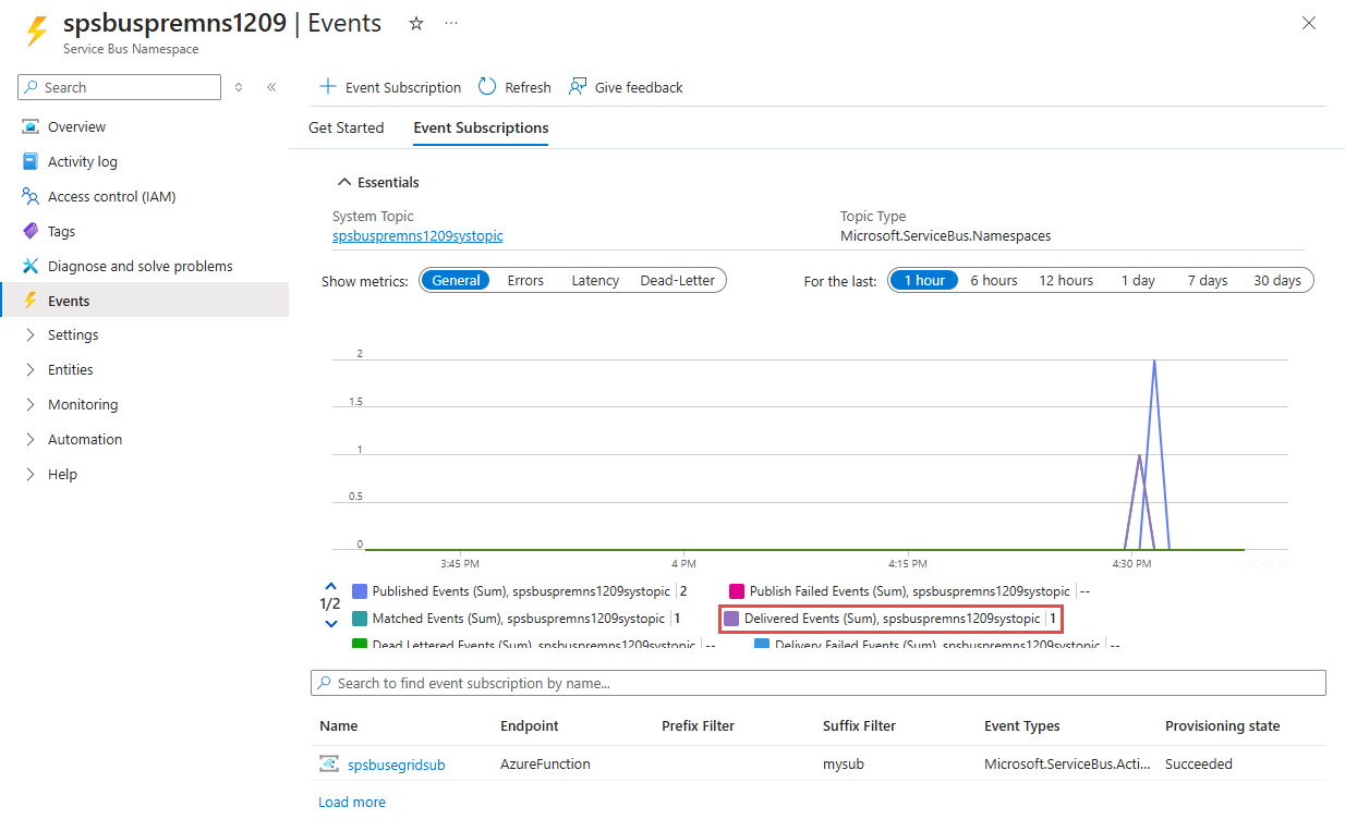 You can also see that the events are delivered on the Event Subscription page. You can get to this page by selecting the event subscription on the Events page.