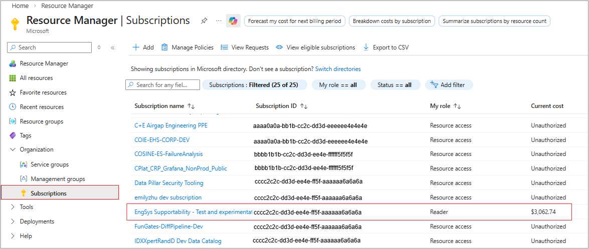 Choose the subscription that you want to manage for Security advisory access.