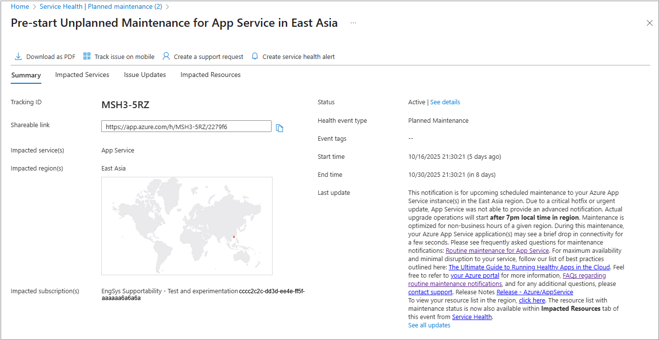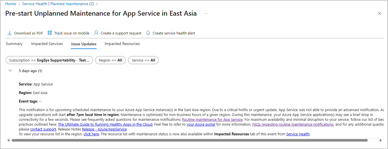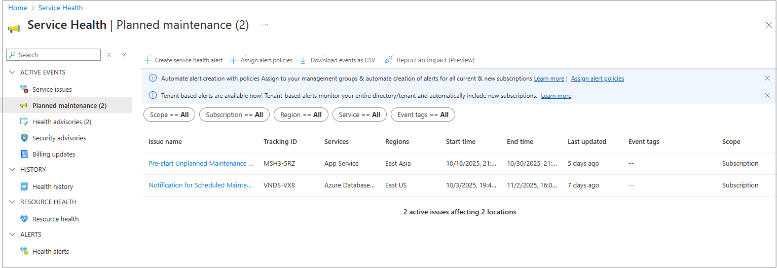 Service Health is designed to be the authoritative place for you to understand maintenance events, assess impact, and be redirected to take action where applicable. For some planned maintenance events, you see the full Service Health experience, which includes:
