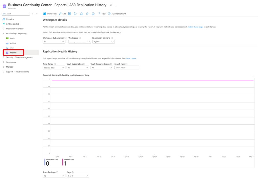 This report provides information about the Site Recovery replicated items and their status over a specified time period. This report also includes failover date and detailed replication health error list for troubleshooting. It offers filters for time range, vault subscription, resource group, and search item and enables focused report generation and visualization.