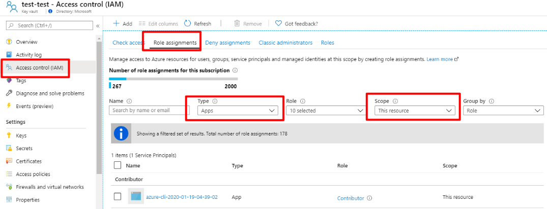 Go to the Key Vault dashboard in Azure portal, select the Access control menu, then open the Role assignments tab. Select Apps for Type and This resource for scope. You should see the credential you created in previous step: