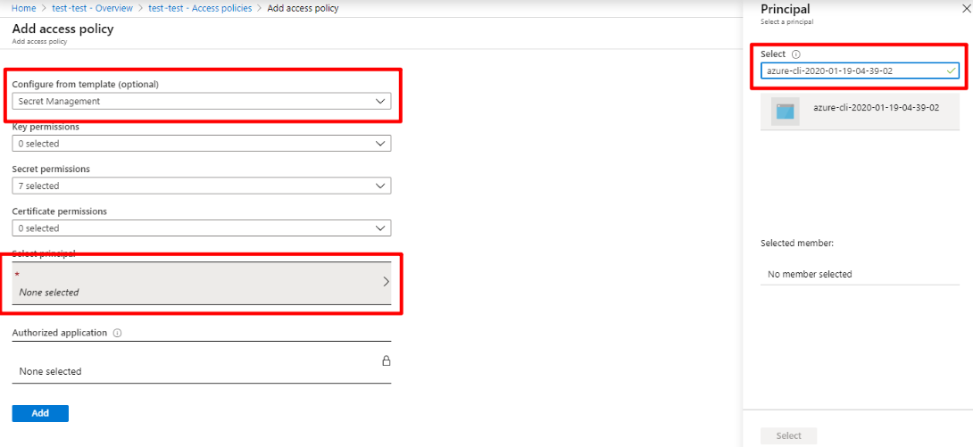 Copy the credential name, for example, azure-cli-2020-01-19-04-39-02. Open the Access policies menu, then select the Add Access Policy link. Select Secret Management for Template, then select Principal. Paste the credential name in Principal/Select input box: