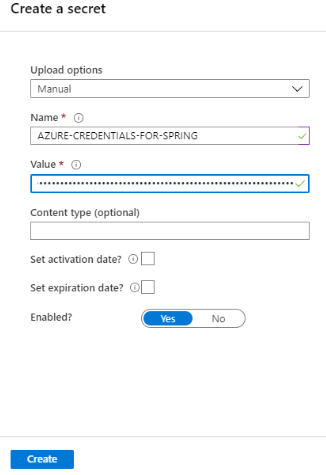 Copy the entire JSON string. Go back to Key Vault dashboard. Open the Secrets menu, then select the Generate/Import button. Input the secret name, such as AZURE-CREDENTIALS-FOR-SPRING. Paste the JSON credential string to the Value input box. You may notice the value input box is a one-line text field, rather than a multi-line text area. You can paste the complete JSON string there.
