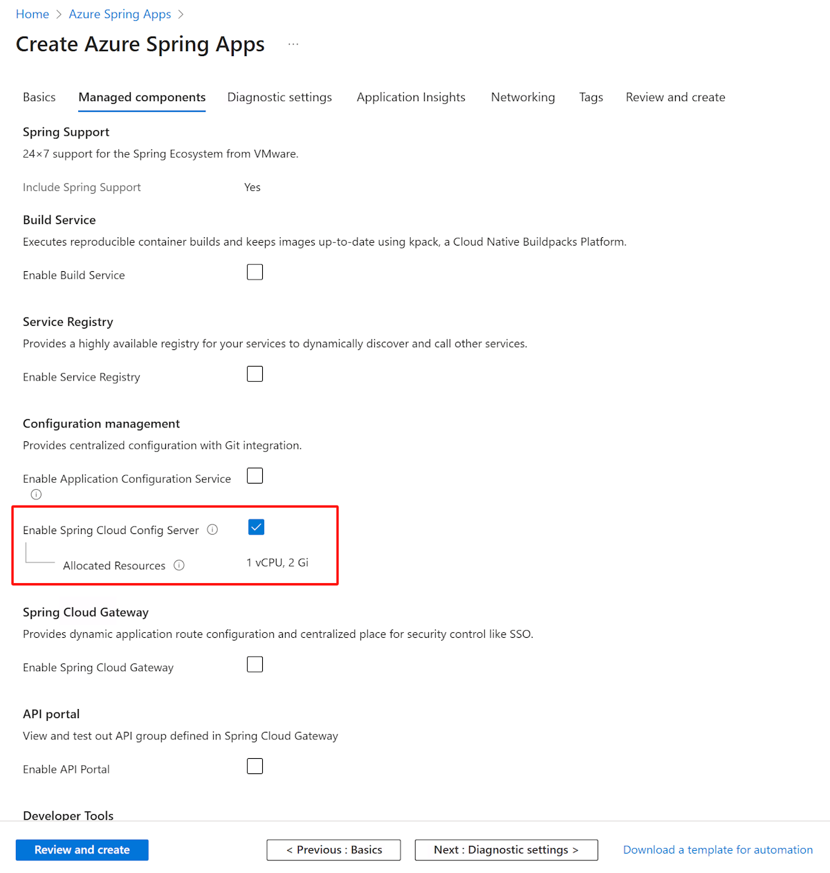 3. On the Managed components tab, select Enable Spring Cloud Config Server.