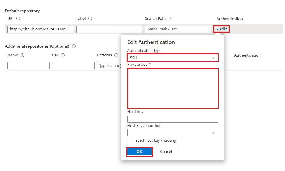 Azure Spring Apps can access Git repositories that are public, secured by SSH, or secured using HTTP basic authentication. HTTP basic authentication is the easiest of the options for creating and managing repositories with Azure Repos.