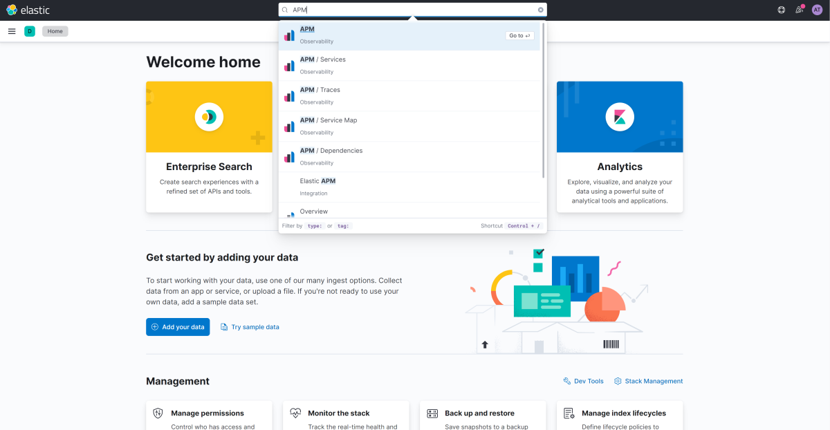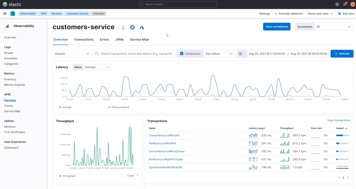 Kibana APM is the curated application to support Application Monitoring workflows. Here you can view high-level details such as request/response times, throughput, and the transactions in a service with the most impact on the duration.