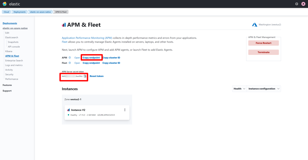 Before proceeding, you need your Elastic APM server connectivity information handy, which assumes you've deployed Elastic on Azure. For more information, see How to deploy and manage Elastic on Microsoft Azure. To get this information, use the following steps: