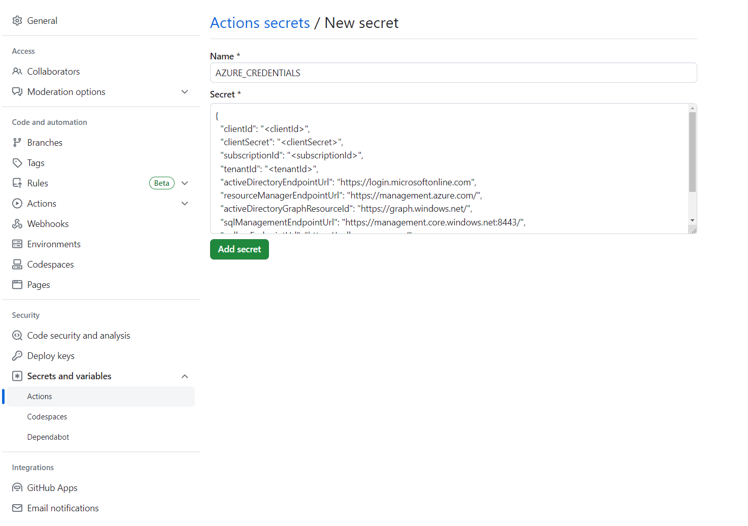 Set the secret name to AZURE_CREDENTIALS and its value to the JSON string that you found under the heading Set up your GitHub repository and authenticate.
