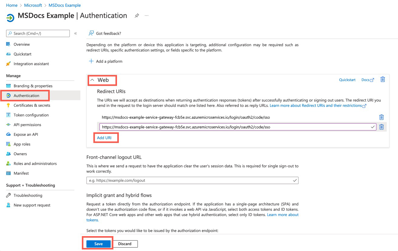 After configuring your Microsoft Entra application, you can set up the SSO properties of Spring Cloud Gateway or API Portal following these steps: