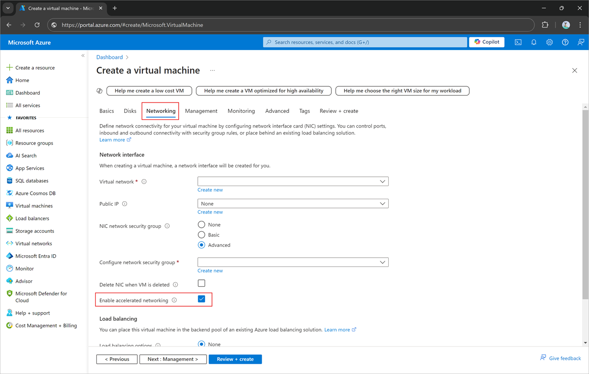 Enable Accelerated Networking on the VM during creation. To learn how to enable it by using Azure PowerShell or Azure CLI, or to enable Accelerated Networking on existing VMs, see Use Azure PowerShell to create a VM with Accelerated Networking.
