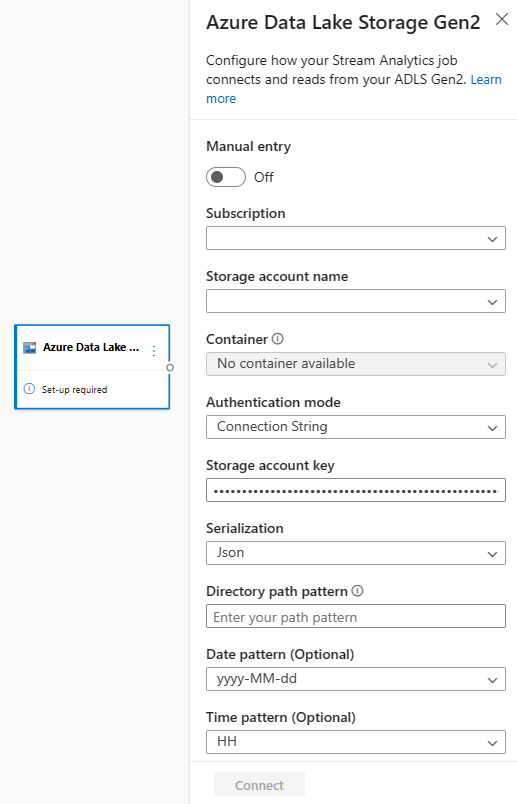 To add an ADLS Gen2 as a streaming input for your job, select the ADLS Gen2 under Inputs from the ribbon. Then fill in the needed information in the right panel to connect ADLS Gen2 to your job. To learn more about the details of each field, see Stream data from ADLS Gen2 to Stream Analytics job