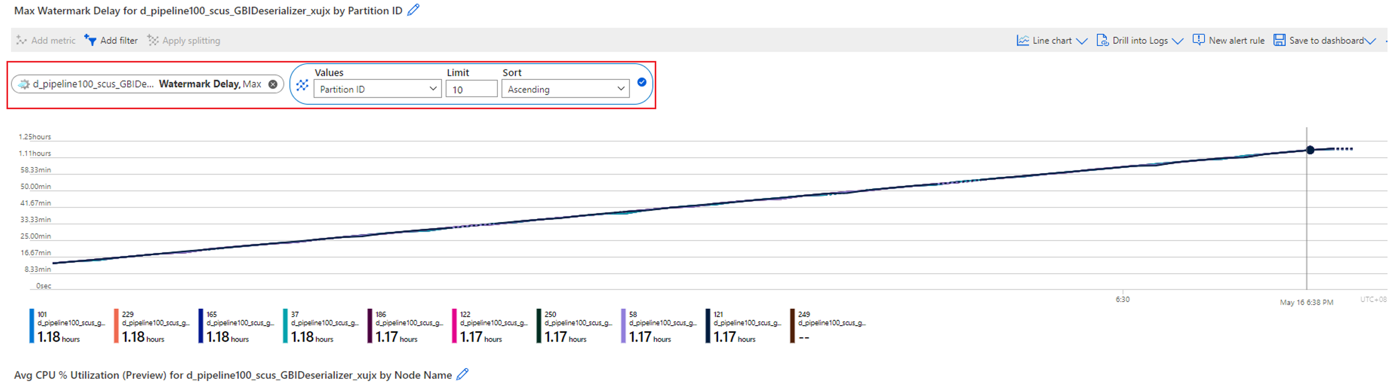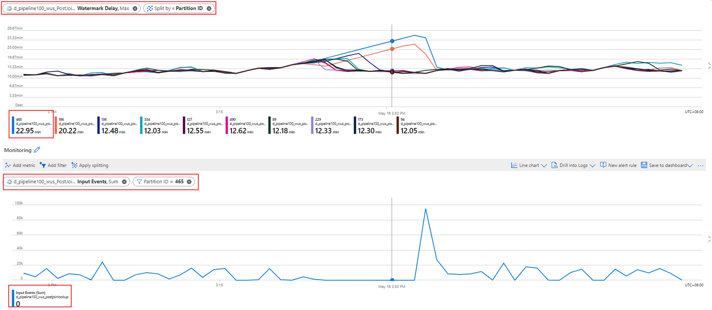 Check which partition has the increasing watermark delay. Select the Watermark Delay metric and split it by the Partition ID dimension. In the following example, partition 465 has a high watermark delay.