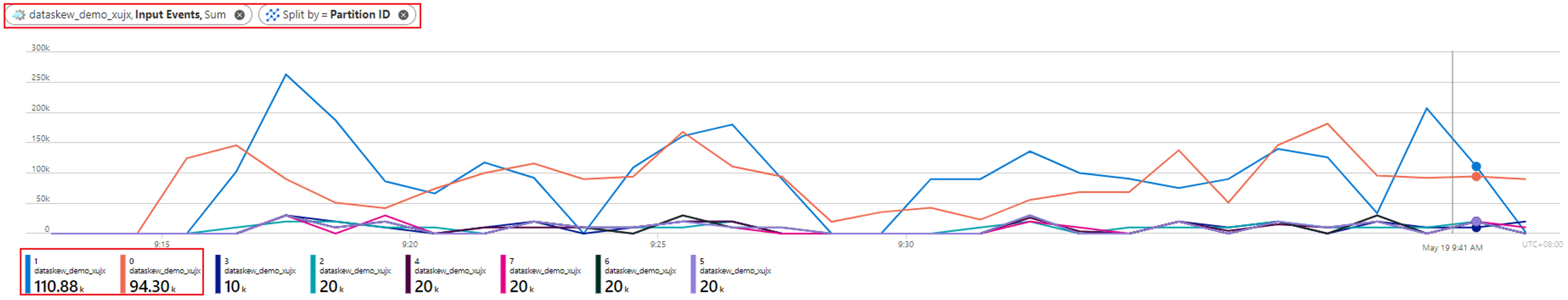 Let's check what the input data looks like for all these partitions with the metric Input Events split by Partition ID: