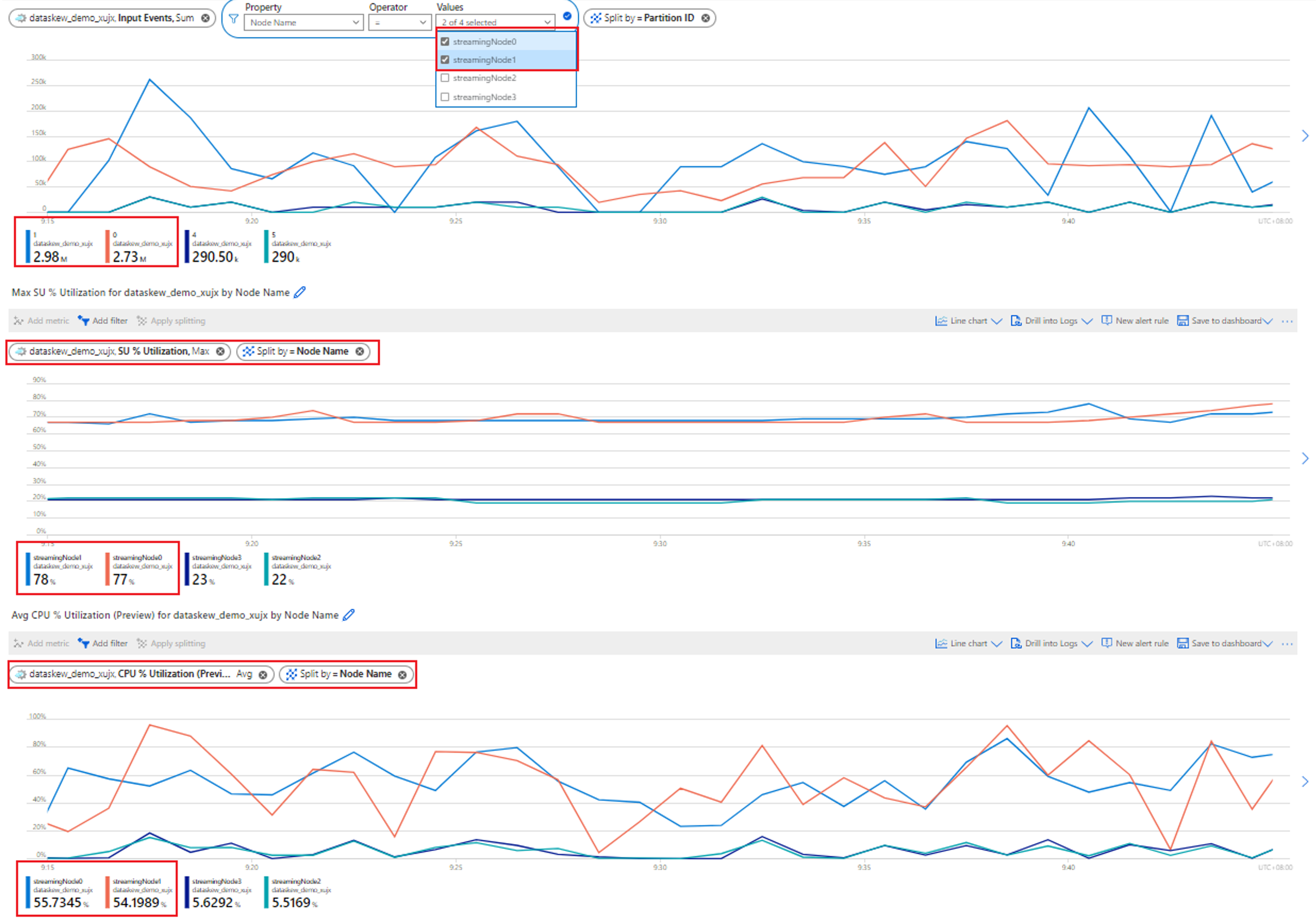 Streaming nodes that process partitions with higher data skew will exhibit higher CPU and/or streaming unit (SU) utilization. This utilization will affect the job's performance and increase watermark delay. To mitigate this, you need to repartition your input data more evenly.