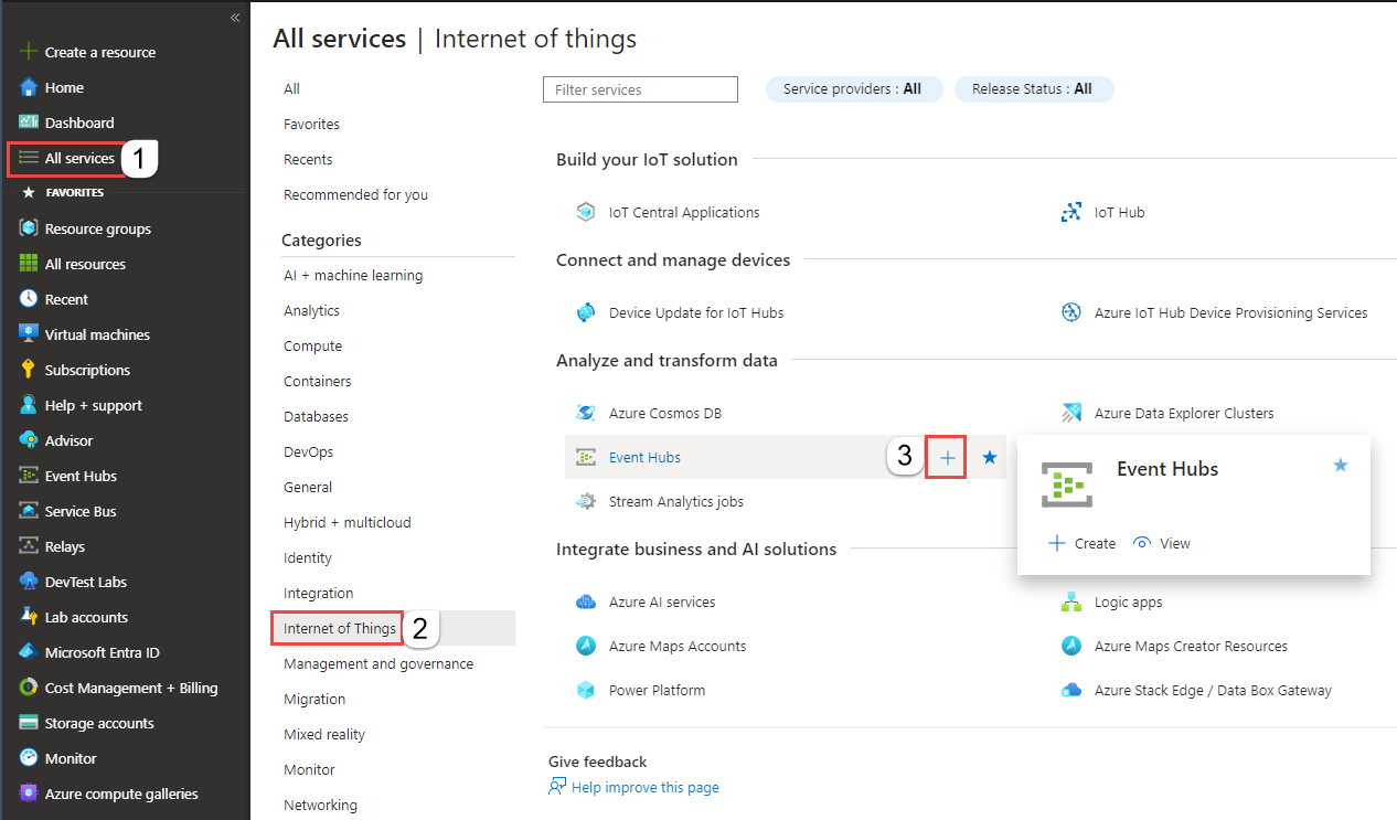 Select All services on the left menu, select Internet of things, mouse the mouse over Event Hubs, and then select + (Add) button.