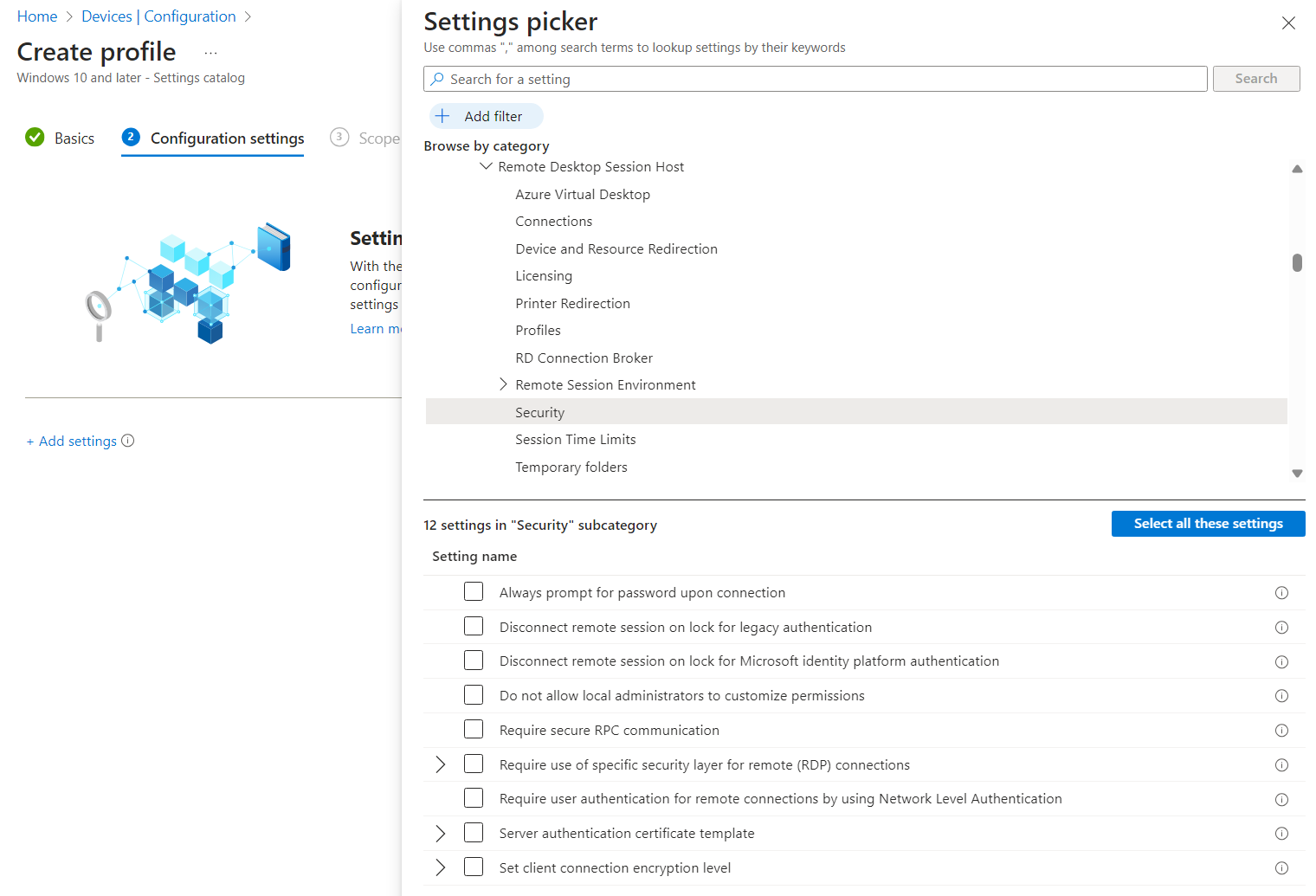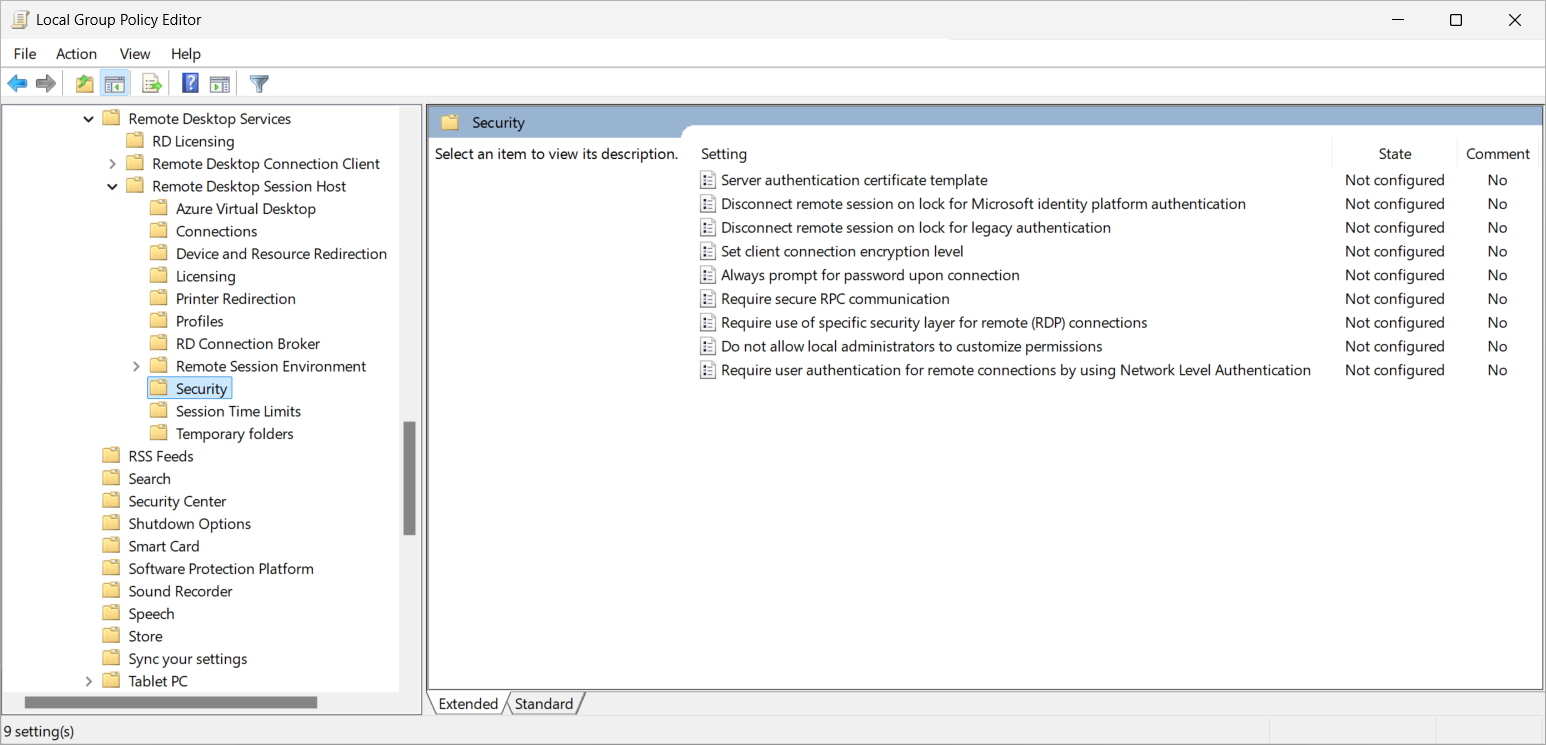 In the settings picker, browse to Administrative templates > Windows Components > Remote Desktop Services > Remote Desktop Session Host > Security.