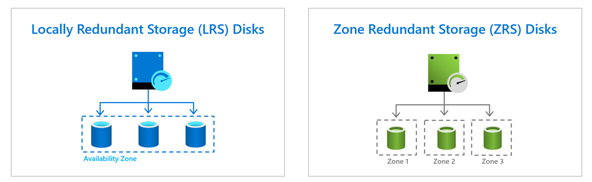Managed disks have two redundancy models, locally redundant storage (LRS) disks, and zone-redundant storage (ZRS) disks. The following diagram depicts how data is replicated with either model.