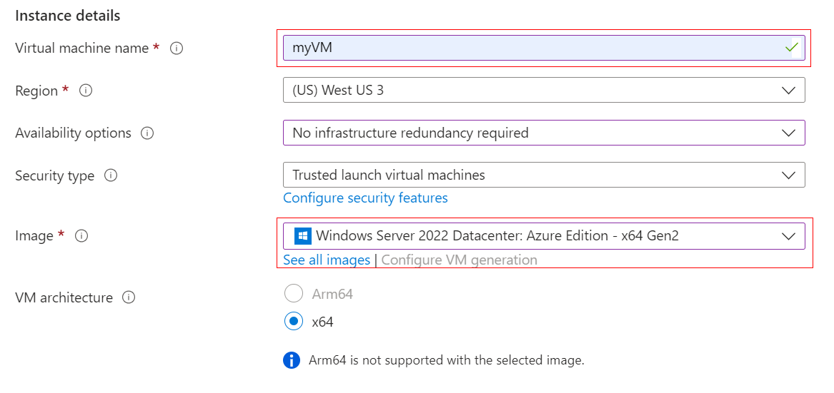 Under Instance details, enter myVM for the Virtual machine name and choose Windows Server 2022 Datacenter: Azure Edition - x64 Gen 2 for the Image. The page will fill in the other fields with defaults and use the VM name to create similar names for the other resources that are needed.