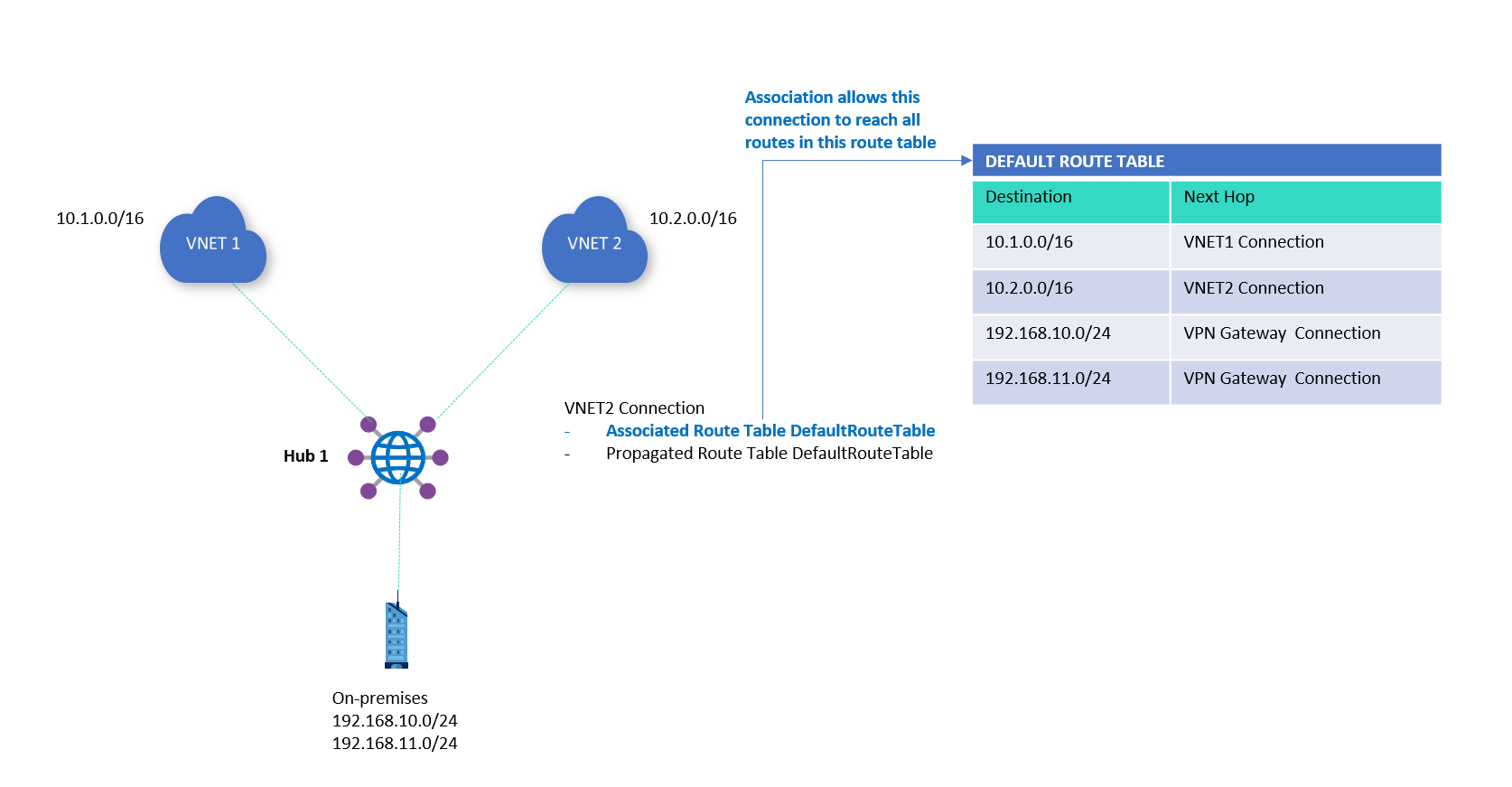 You can set up the routing configuration for a virtual network connection during setup. By default, all connections associate and propagate to the Default route table.