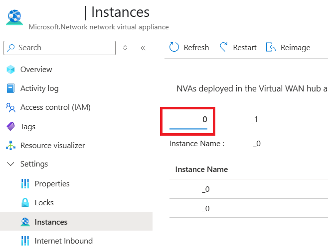 - Instance provided does not exist: Reimage API request body references instance IDs. To determine which instance IDs are currently in use, navigate to Instances in Azure portal for your NVA resource. Virtual WAN names NVA instances with the following naming convention: "nvaresourcename_instanceID". In the example below, valid instance IDs are "0" and "1".