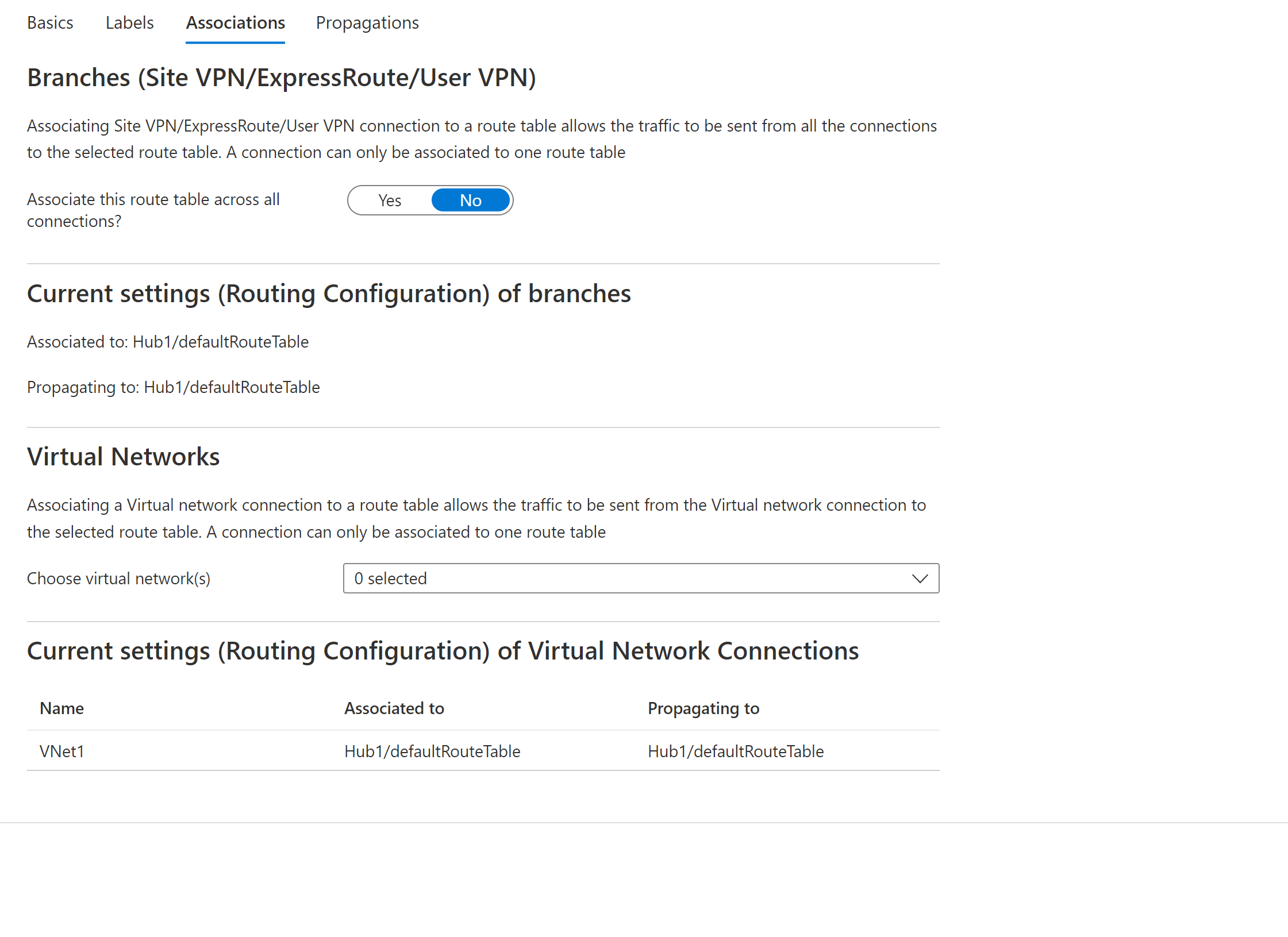 On the Associations page, associate connections to the route table. You'll see Branches, Virtual Networks, and the Current settings of the connections. After configuring settings, move to the Propagations page.