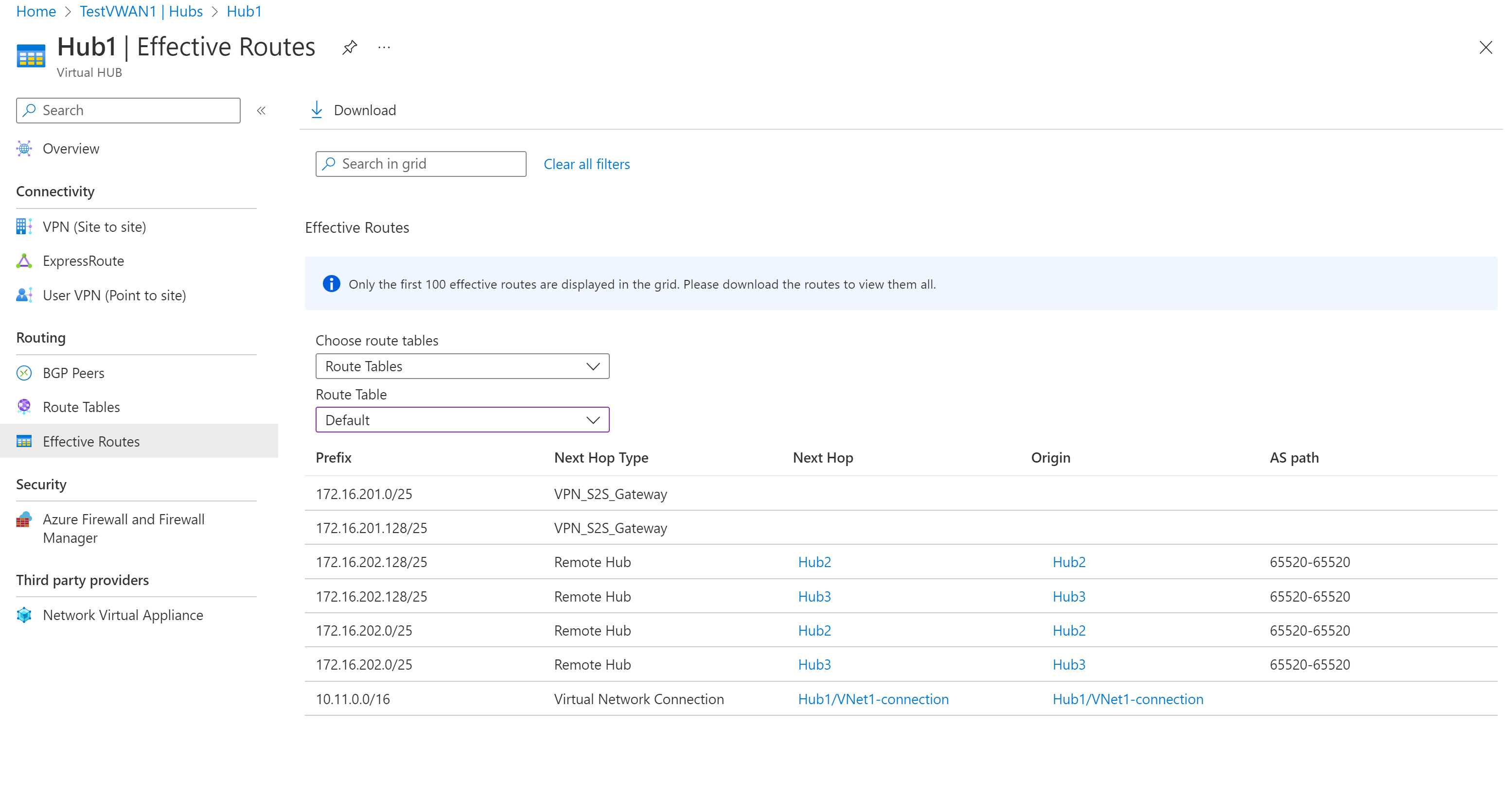 - For more information about virtual hub routing, see About virtual hub routing.