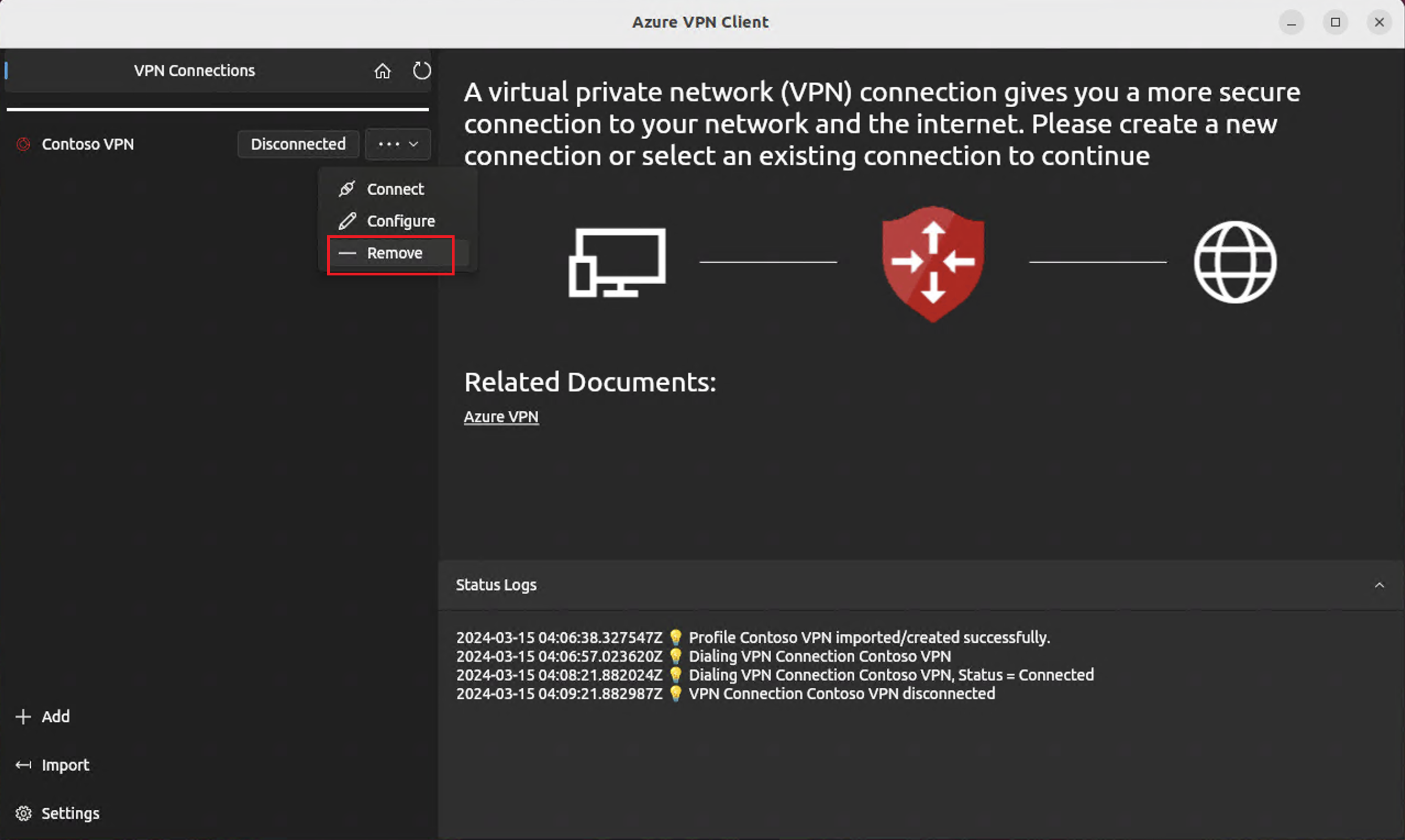 On the Azure VPN client, select the connection you want to remove. Then, from the dropdown, select Remove.