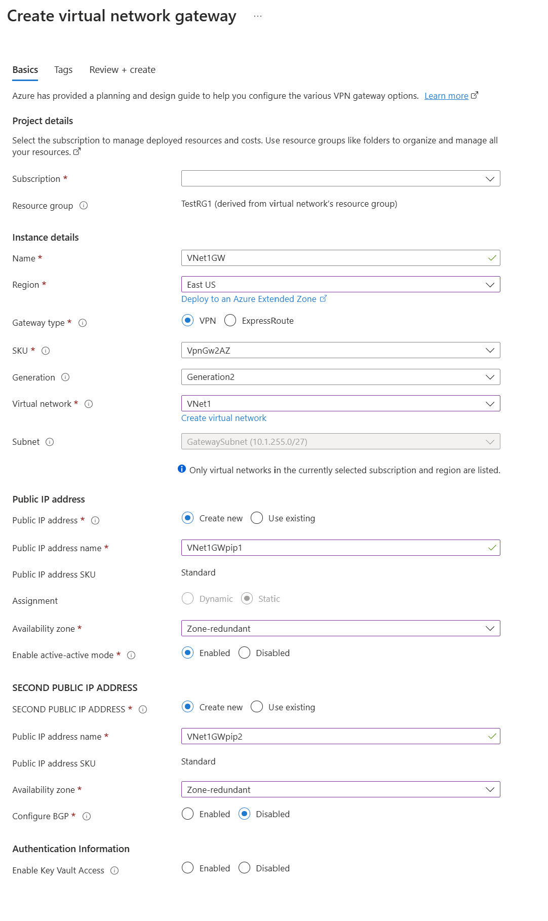 - Some VPN devices don't support active-active mode. If you're not sure, check with your VPN device vendor. If you're using a VPN device that doesn't support active-active mode, you can select Disabled for this setting.Second public IP address name Only available for active-active mode gateways. Example: VNet1GWpip2 Availability zone Example: Zone-redundant. Configure BGP Select Disabled, unless your configuration specifically requires this setting. If you do require this setting, the default ASN is 65515. Enable Key Vault Access Select Disabled unless you have a specific requirement to enable this setting. Select Review + create to run validation.