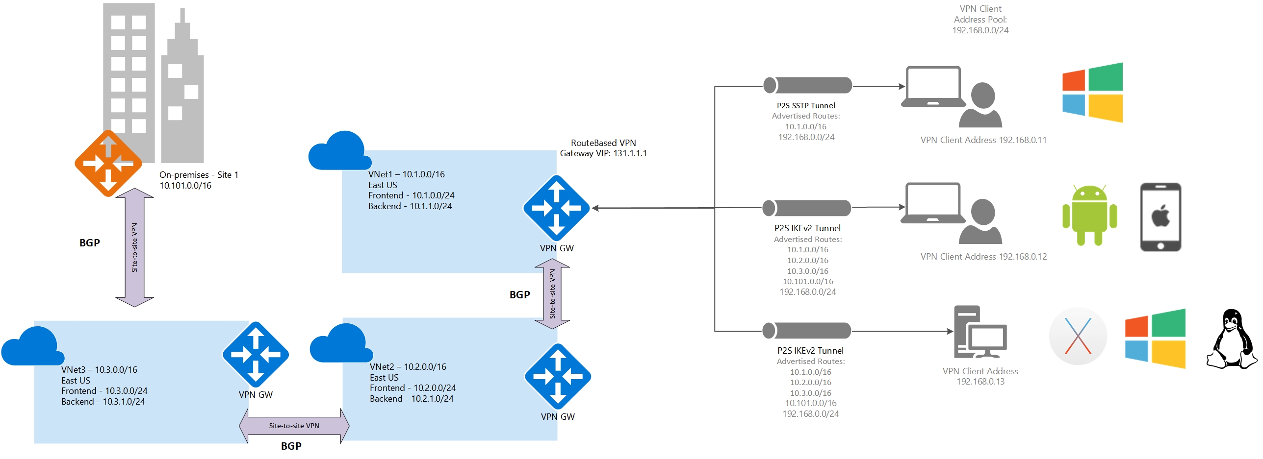Routes added to Windows clients: 10.1.0.0/16, 192.168.0.0/24