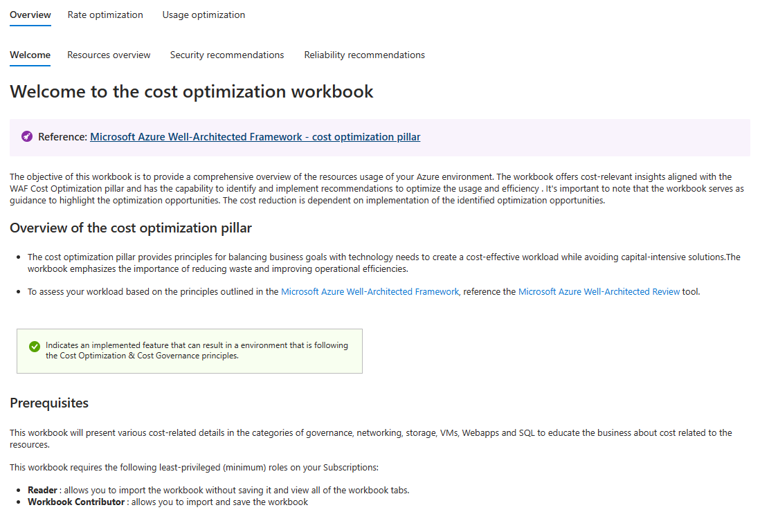 For more information about the Cost optimization workbook, see Understand and optimize your Azure costs using the Cost optimization workbook.