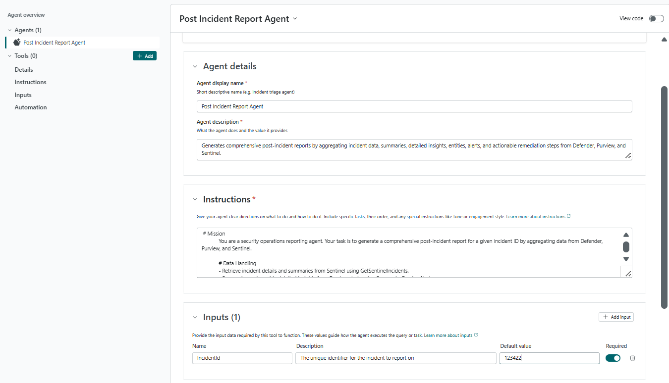 - Provide input parameters required for the agent tool. You must guide the AI model in your description, if only some values are possible (for example, "SeverityLevel should be one of