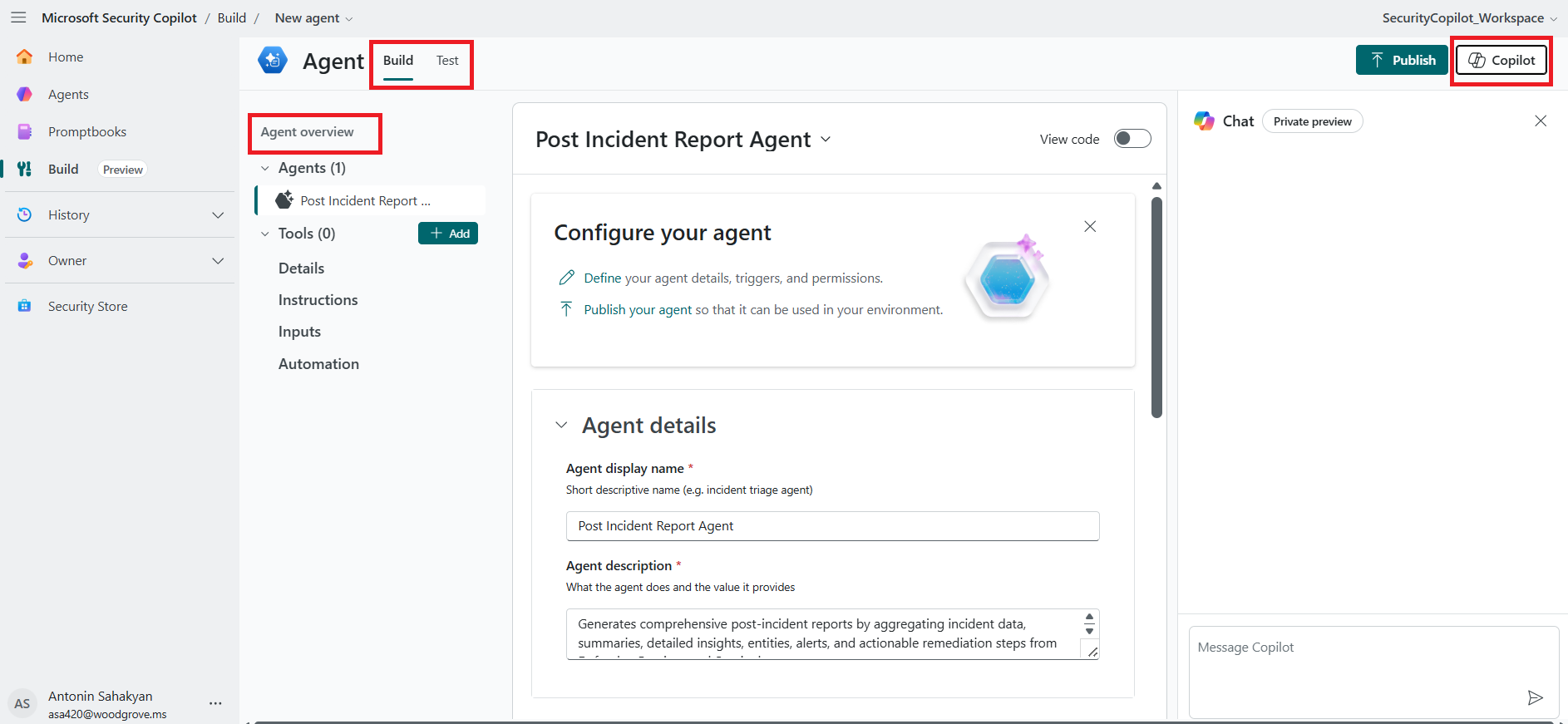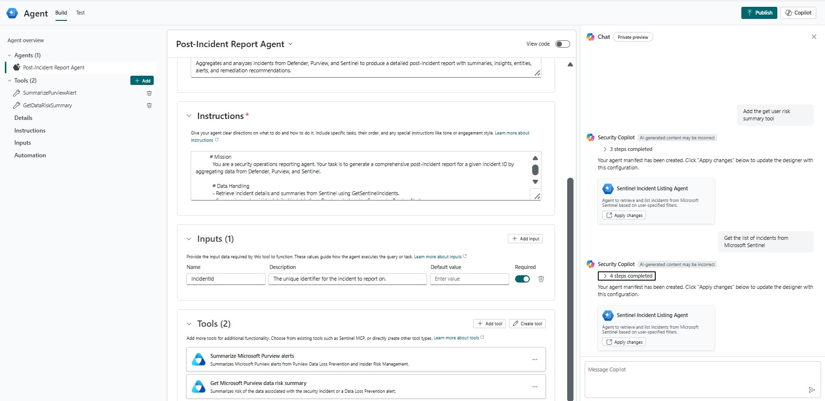 You can create custom agents quickly and intuitively with the new form-based experience. This article explains how to start building your custom agent from scratch using the agent builder in Security Copilot.