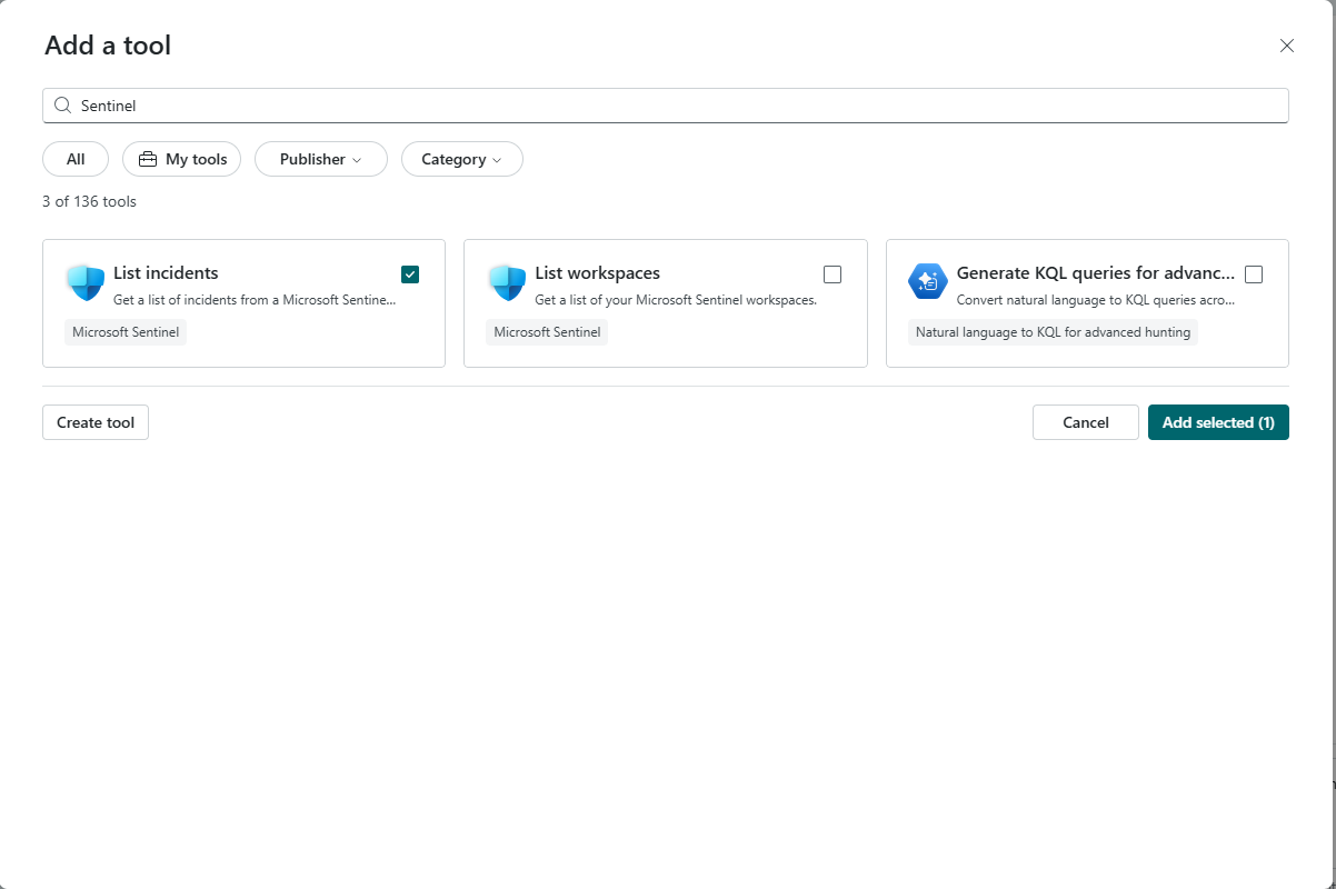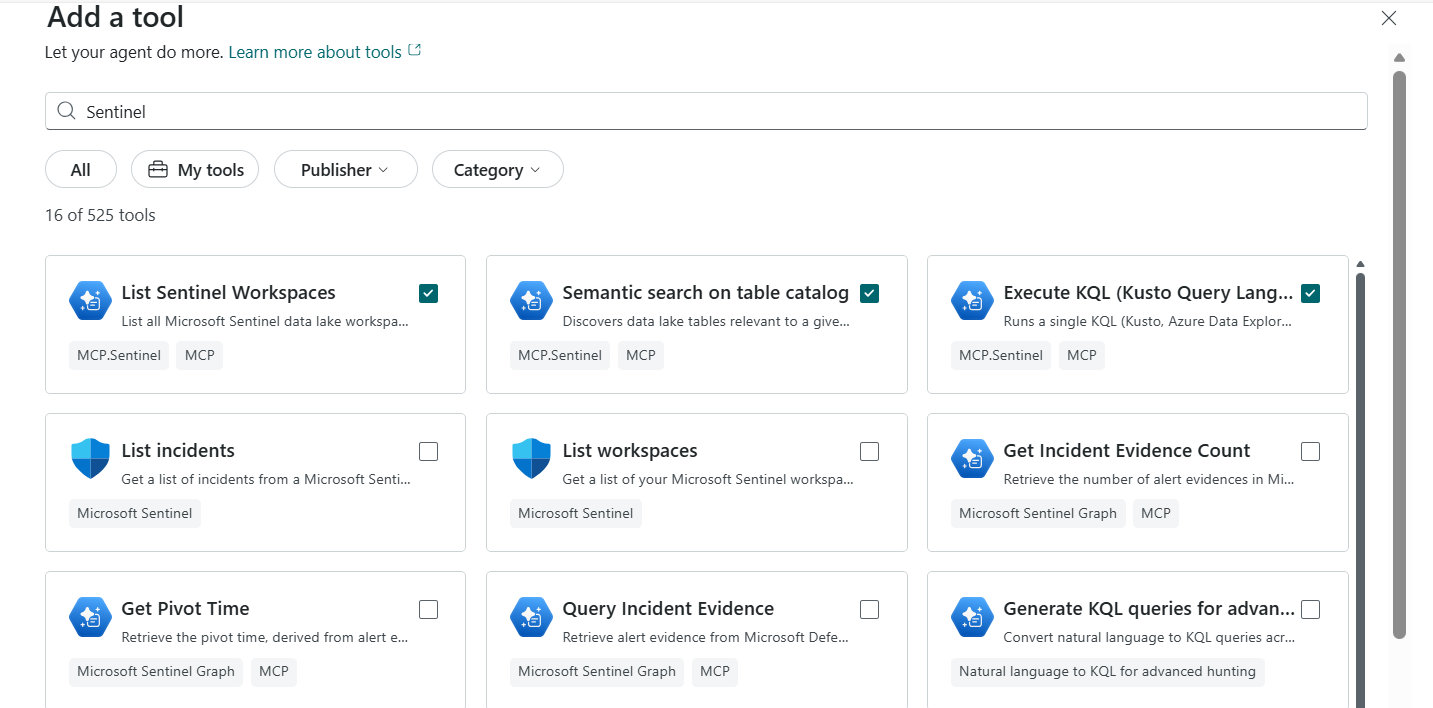 Search: You can search for the tool in the Search bar (semantic search). The agent uses these skills or tools to accomplish a specific task. You can apply filters to improve discoverability for search. For example, to add Microsoft Sentinel's collection of MCP tools, search by the keyword or filter by Publisher: MCP.Sentinel.