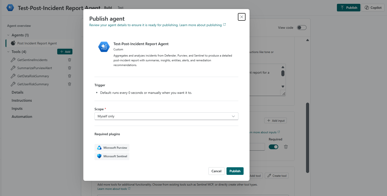 - Myself only: After publish, the agent is visible only to the publisher.