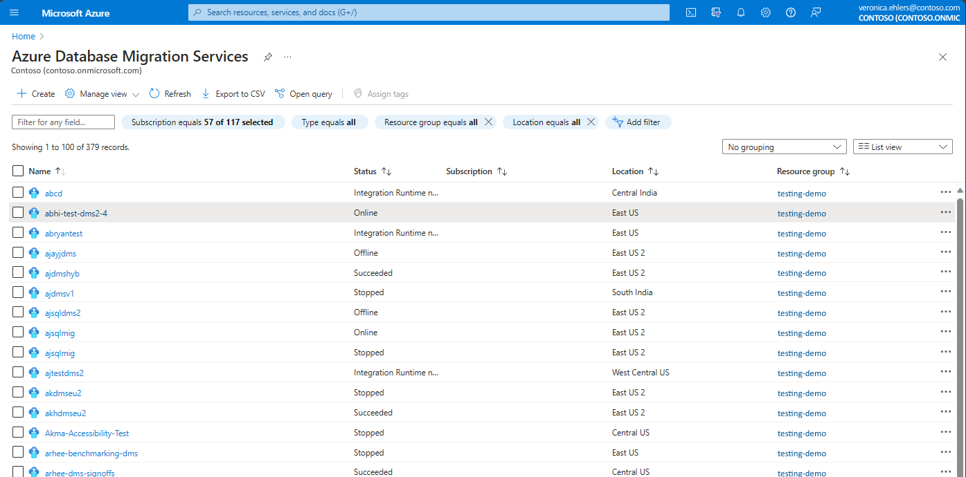 On Azure portal, under Azure Database Migration Services, select an existing instance of Database Migration Service that you want to use, ensuring that it's present in right Resource Group and region.