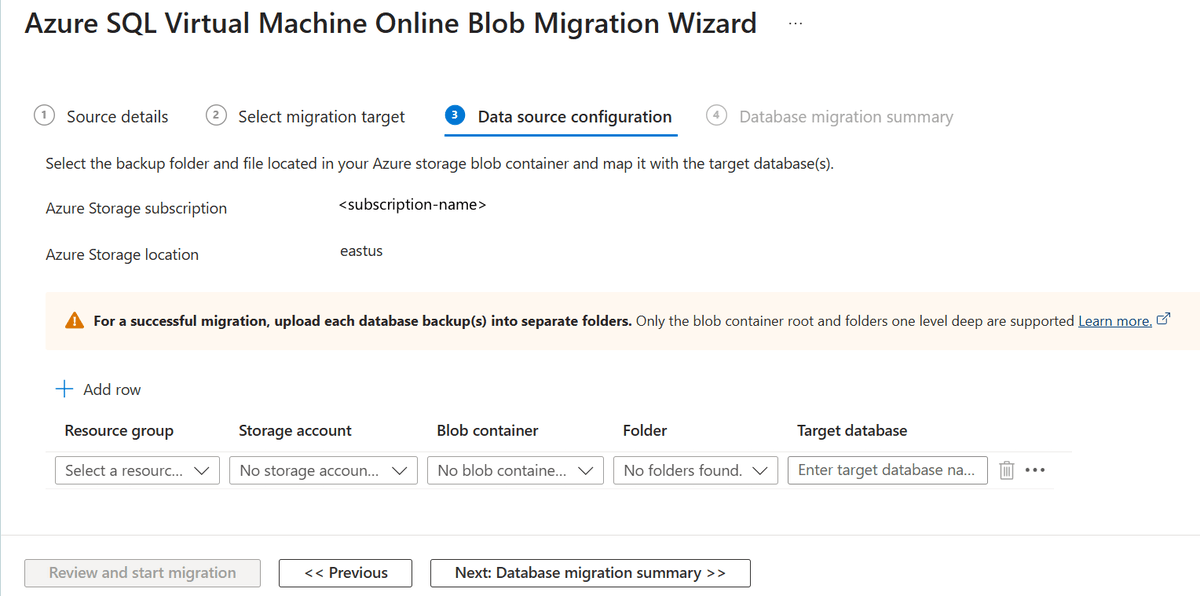On the Azure SQL Virtual Machine Online Blob Migration Wizard, follow these steps: