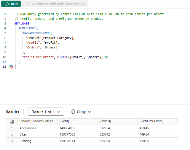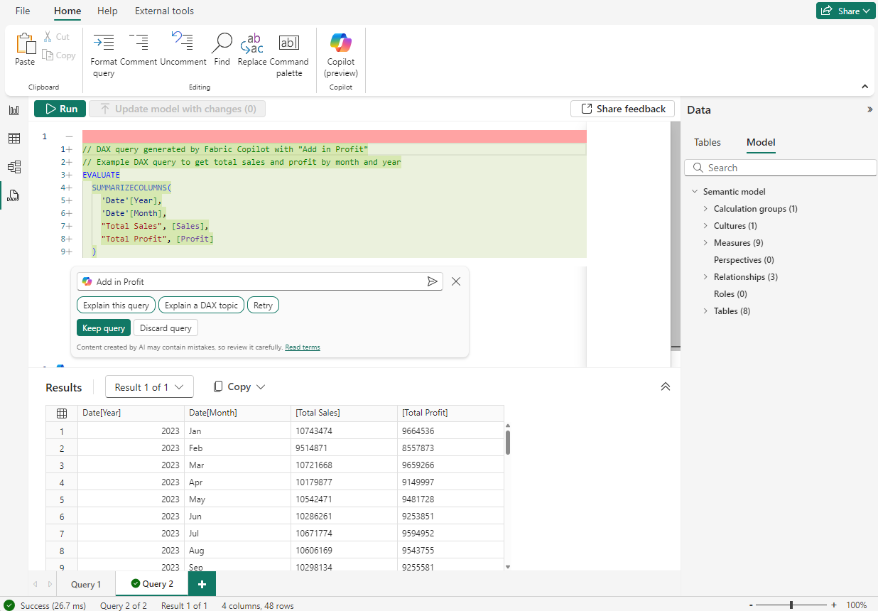 Let’s look at what Copilot can help you with in DAX query view: