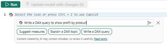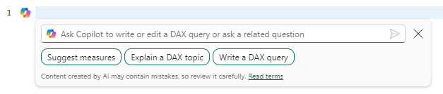 - Copilot to help write DAX queries is contained in the privacy, security, and responsible use of Copilot in Fabric.