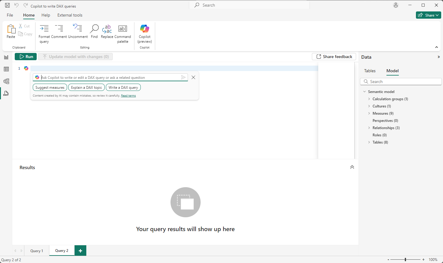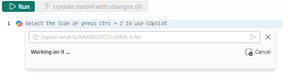- Natural language to DAX query. Just ask for what you want from your semantic model and have the DAX query generated by Copilot. You can also select an existing DAX query and have Copilot modify it.