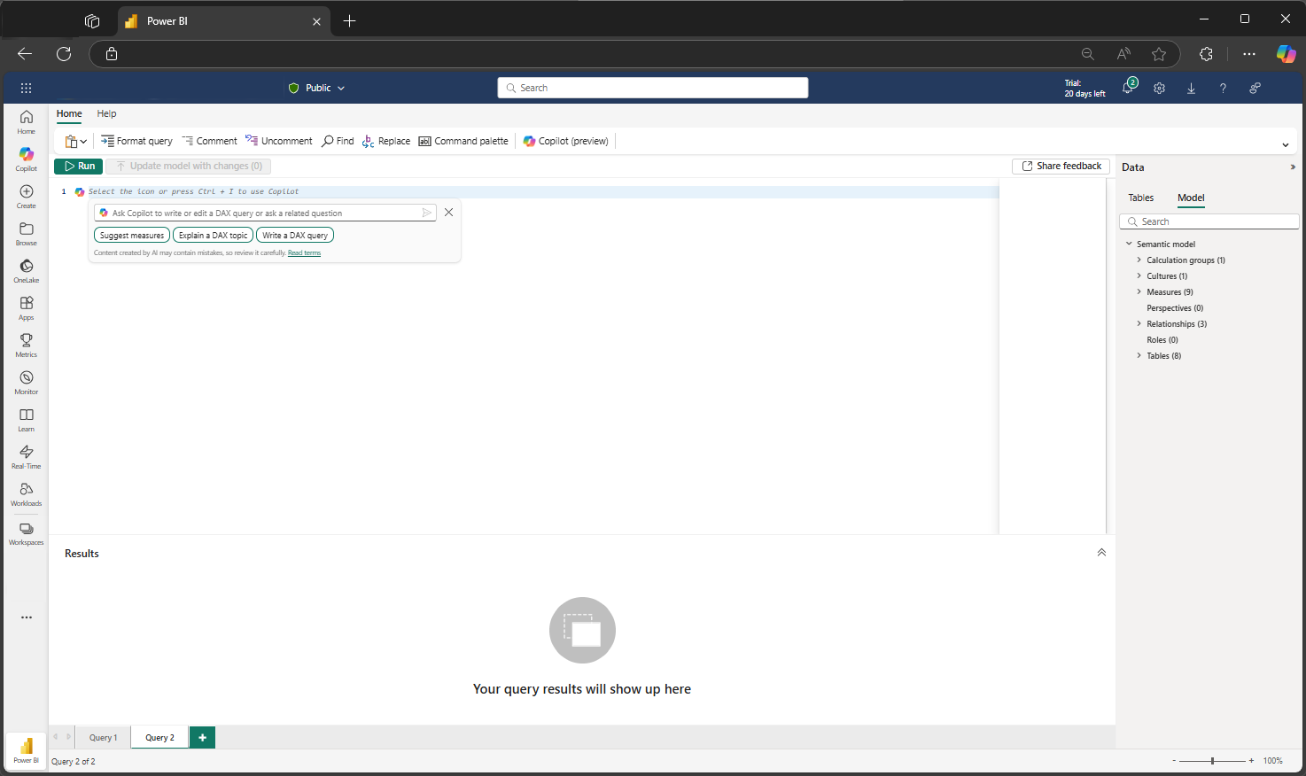 - To use Copilot to help write DAX queries, you need to select a workspace with a Fabric capacity.